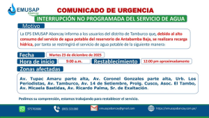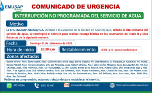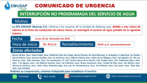 COMUNICADOS 29 mayo, 2024 Last updated : 29 mayo, 2024 emusa7 Interrupción no programada del servicio de agua potable, debido a la rotura de tubería en la AV. PANAMERICANA.
