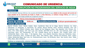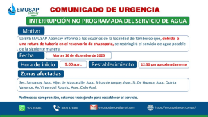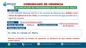 INTERRUPCION NO PROGRAMADA DEL SERVICIO DE AGUA POTABLE 24 agosto, 2024 Last updated : 26 agosto, 2024 emusa7 Interrupción no programada del servicio de agua potable debido al alto consumo de agua potable se cerrara el reservorio de PRADO II para realizar una recarga hídrica.