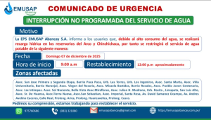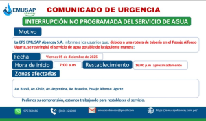 Interrupción programada del servicio de agua potable debido a una rotura de tubería en la AV. JULIO C. TELLO.