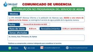 ✅ La EPS EMUSAP Abancay ha concluido con éxito los trabajos de renovación de las redes de agua potable en importantes sectores de la ciudad, como el Jr. Libertadores, la Urb. Casitas del Banco, la Av. Daniel Alcides Carrión y el Jr. Cahuide. Estas obras forman parte del Proyecto de Renovación de Red de Distribución […]