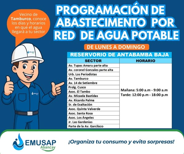 Conoce la programación de abastecimiento de agua potable para los sectores que se abastecen del Reservorio de Antabamba Baja.
