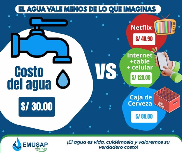 EL AGUA VALE MENOS DE LO QUE IMAGINAS 21 agosto, 2025 Last updated : 25 agosto, 2025 emusa7 El agua nunca te falla ¿Caja de cerveza? Se acaba rápido. ¿Internet? Se corta cuando llueve. ¿Netflix? A veces ni lo usas. El agua está contigo todos los días: ¡es vida y lo más económico de tu hogar! Valoremos cada gota, porque sin agua no hay vida.