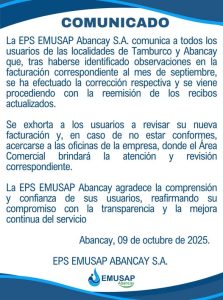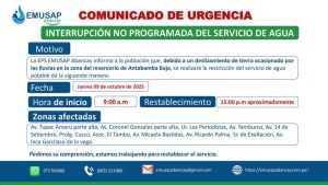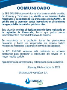 Frente a los deslizamientos de tierra que afectaron la captación de Chanccalla y que podrían generar el desabastecimiento de agua en la localidad de Abancay y Tamburco, continuamos trabajando de manera ininterrumpida, reafirmando nuestro compromiso con la población y nuestro firme propósito de garantizar la continuidad del servicio de agua potable. Nuestro equipo permanece en […]