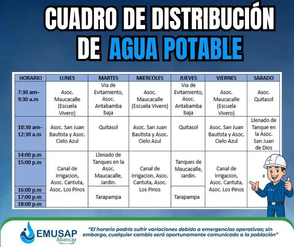 Les compartimos la programación del abastecimiento de agua potable en los diferentes sectores del distrito.