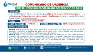 Asimismo, informamos que en el sector de Puca Puca el servicio se ha visto afectado debido a los trabajos que ejecuta la empresa China Railway, como parte del proyecto de la Vía de Evitamiento. Frente a ello, la EPS EMUSAP Abancay ha solicitado a dicha empresa adoptar medidas más eficientes que eviten nuevas interrupciones y mitiguen el impacto en el suministro de agua a las familias del sector.