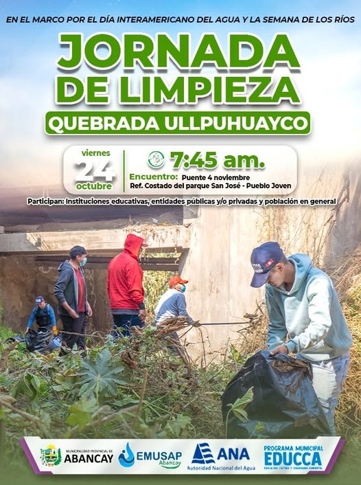 La EPS EMUSAP Abancay, en coordinación con la Municipalidad Provincial de Abancay y la Autoridad Nacional del Agua (ANA), convoca a toda la ciudadanía a participar en una gran jornada de limpieza de la quebrada Ullpuhuayco, organizada en el marco del Día Interamericano del Agua y la Semana de los Ríos 2025.