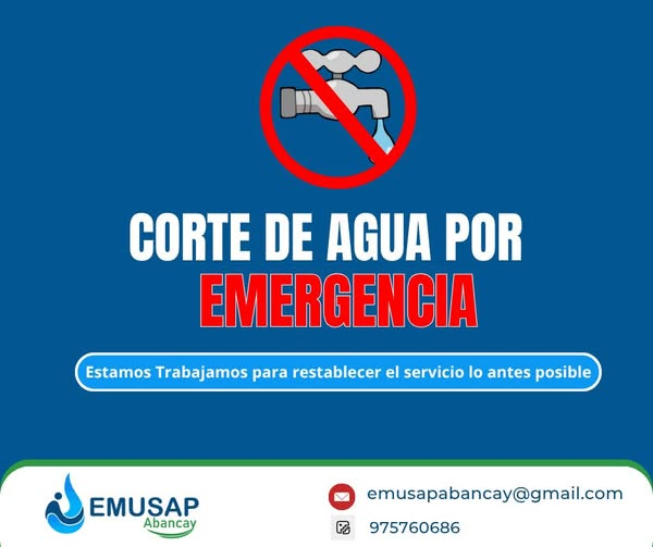 La EPS EMUSAP Abancay informa a la población que, debido a una rotura en la tubería matriz de la captación de Marca Marca, se procederá a restringir el servicio de agua potable en toda la ciudad de Abancay el día de hoy, desde las 14:00 p.m. hasta las 20:00 p.m., mientras se realizan los trabajos de reparación correspondientes.
