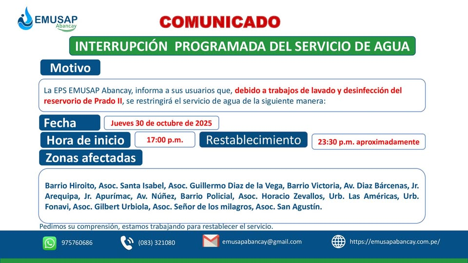 ¡CORTE DEL SERVICIO DE AGUA POTABLE PROGRAMADO ! 30 octubre, 2025 Last updated : 25 noviembre, 2025 emusa7
