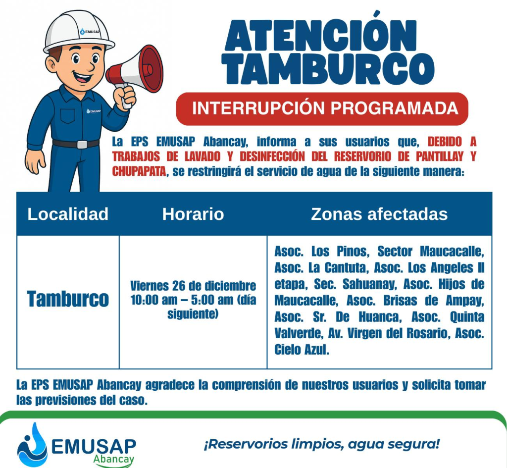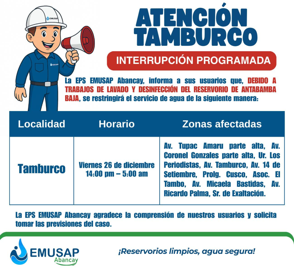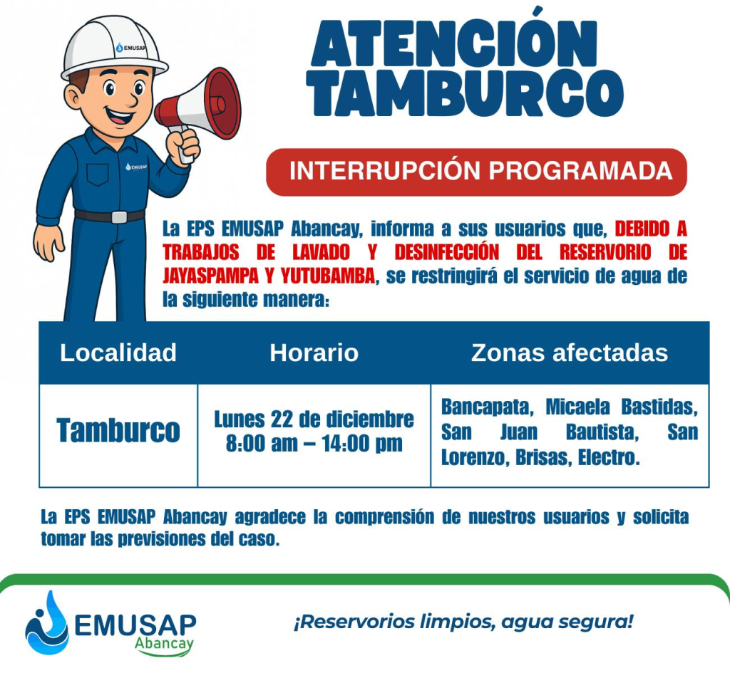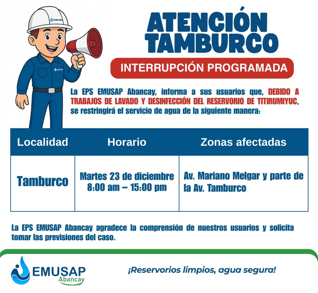 La EPS EMUSAP Abancay informa a la población sobre los cortes programados en el servicio de agua potable durante el mes de diciembre, los cuales serán necesarios para realizar trabajos de lavado y desinfección de los reservorios del distrito de Tamburco.